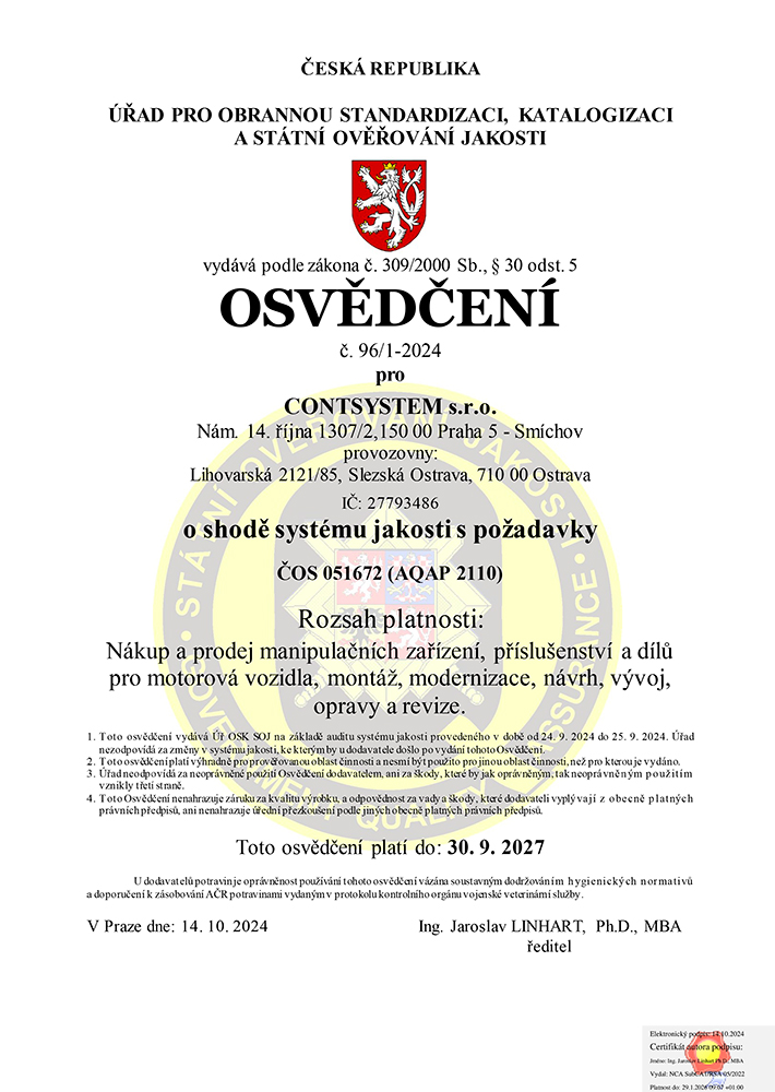 Pracujeme ve shodě jakosti s požadavky dle ČSN EN ISO 9001, ČSN EN ISO/IEC 27001, AQAP 2110 a dále splňujeme mezinárodní standardy pro kontrolu a zabezpečení služeb a ochrany dat.