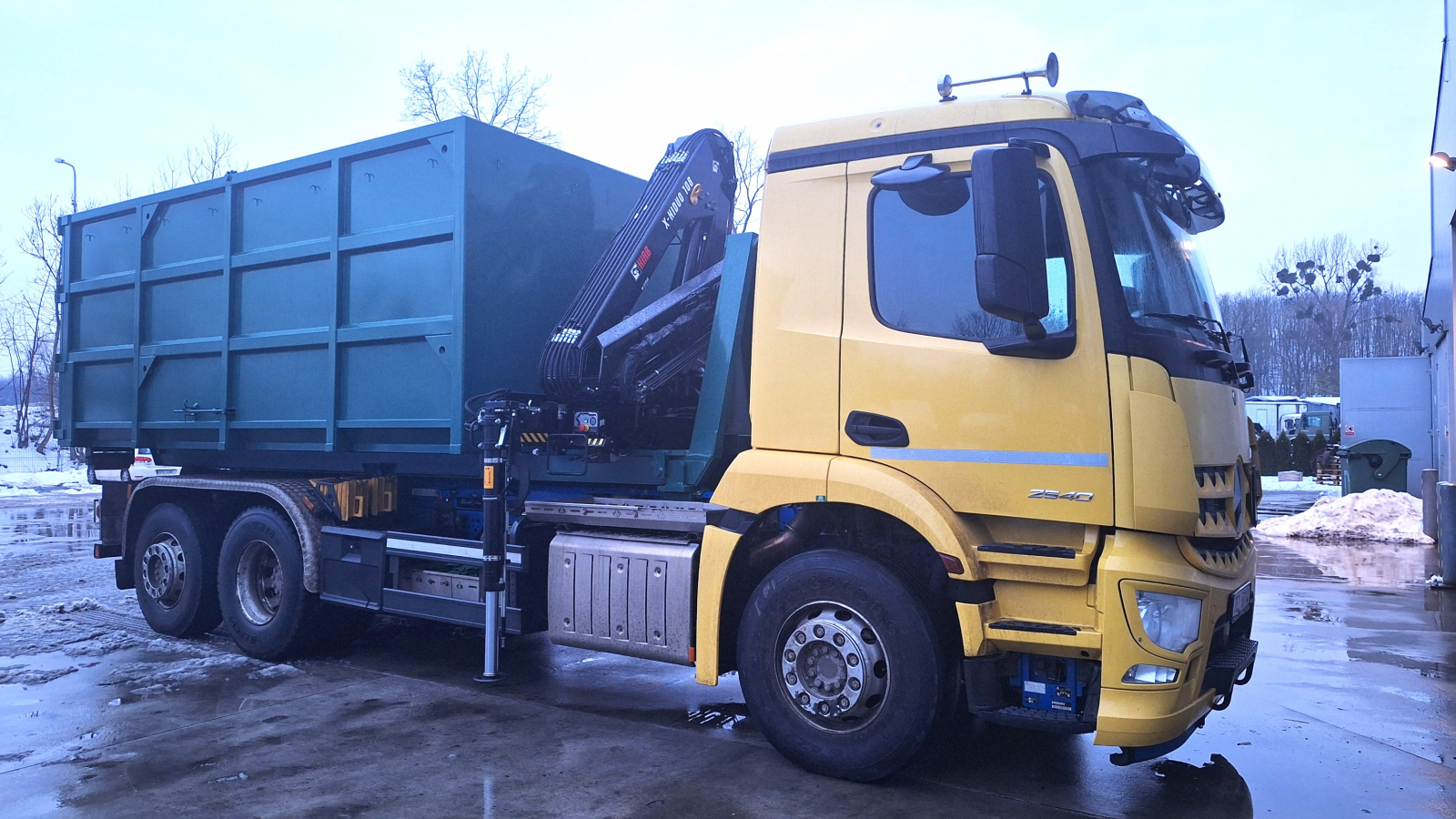 Hydraulický nakládací jeřáb HIAB X-HIDUO 108 B-2 - montáž na kontejneru, na podvozku MERCEDES