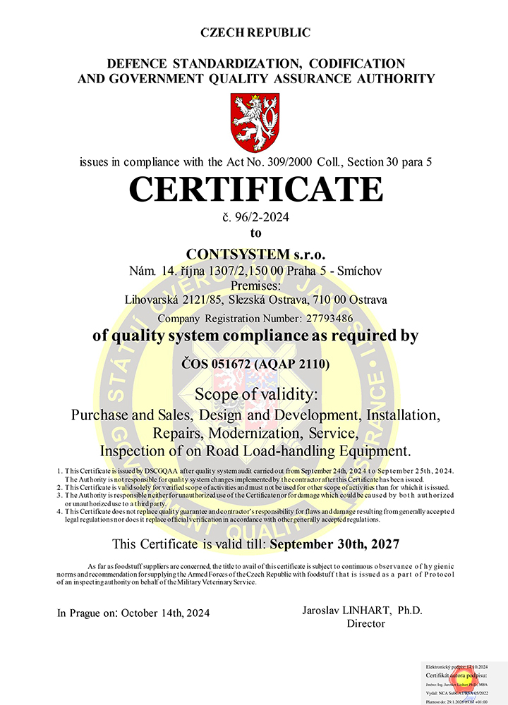 We work in accordance with the quality requirements of ČSN EN ISO 9001, ČSN EN ISO/IEC 27001, AQAP 2110 and we also meet international standards for control and security of services and data protection.